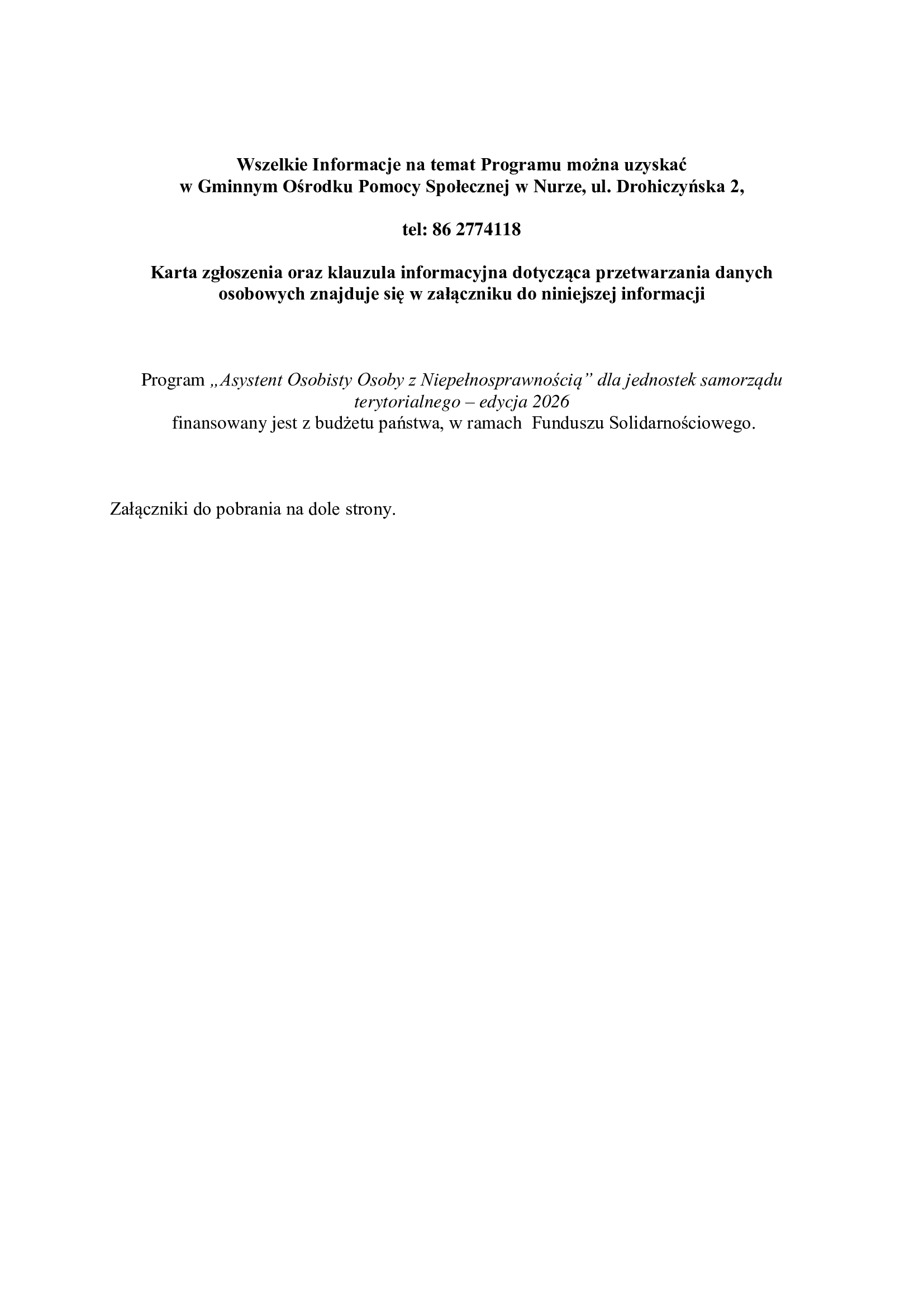 Osoby zainteresowane lub ich opiekunowie mogą uzyskać szczegółowe informacje u pracowników Gminnego Ośrodka Pomocy Społecznej w Nurze osobiście lub telefonicznie – tel. 86 277 41 18