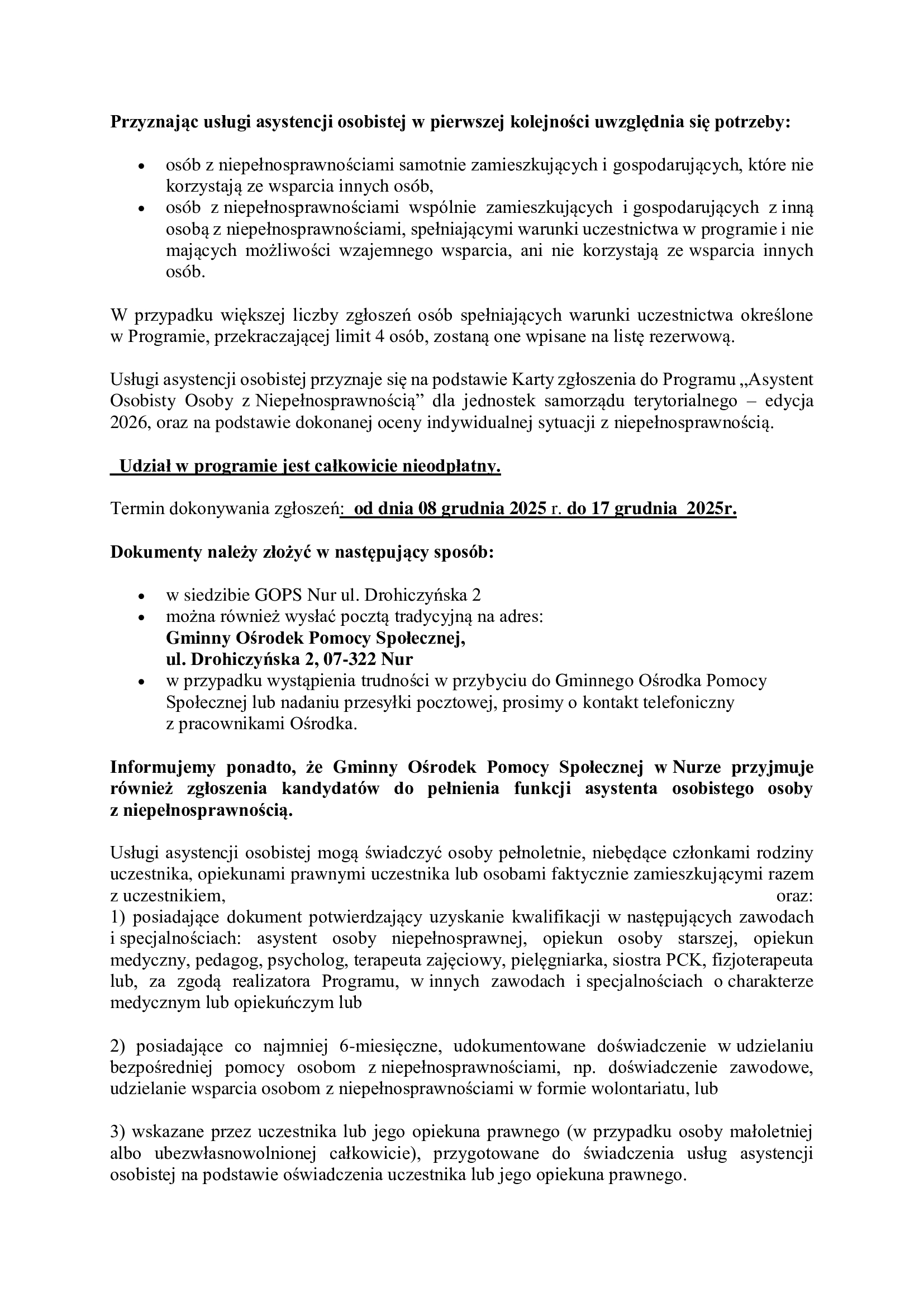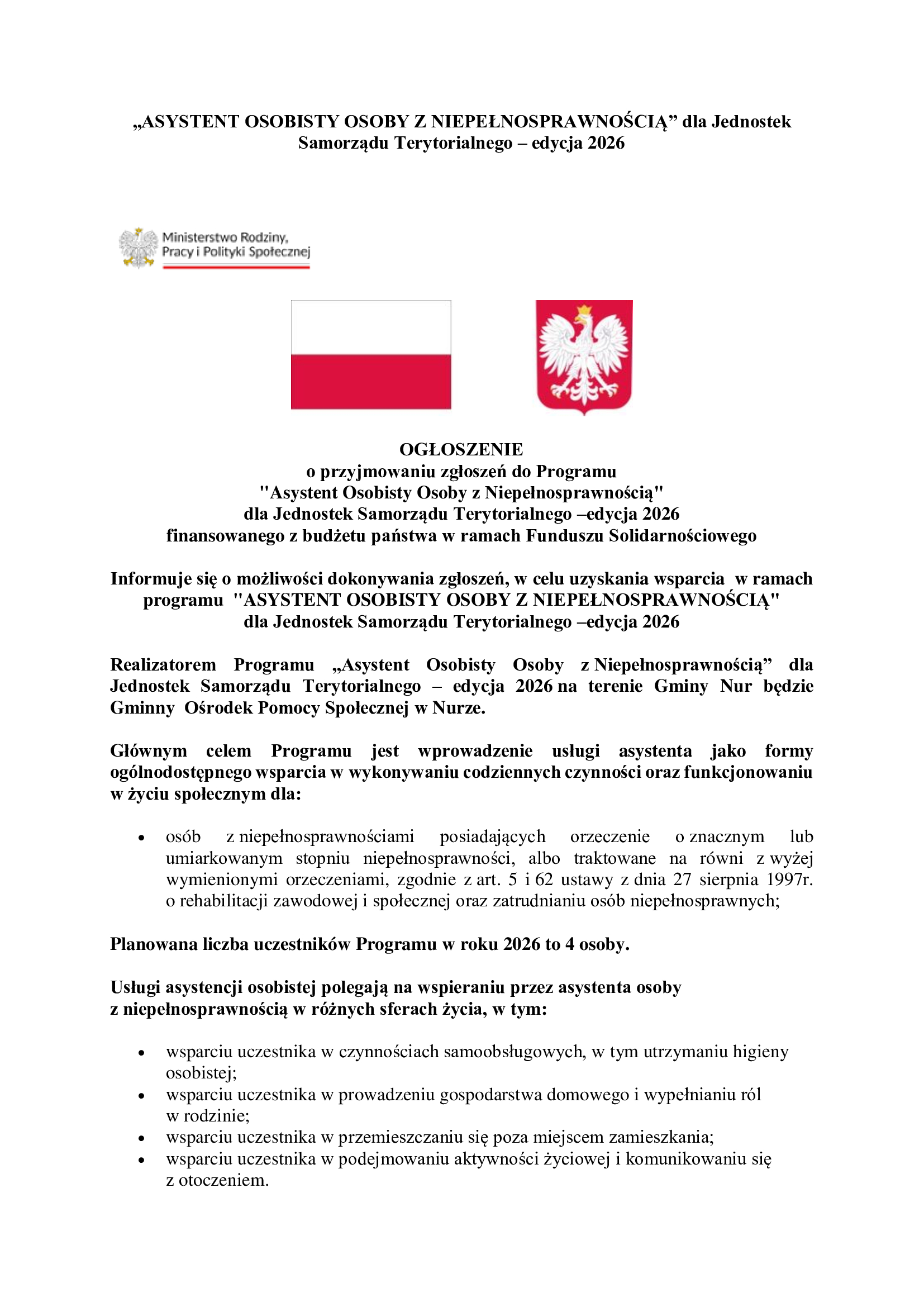 Gminny Ośrodek Pomocy Społecznej w Nurze, informuje, że z dniem 14 sierpnia 2025 r. rozpoczął się nabór wniosków do Programu „Asystent osobisty osoby z niepełnosprawnością„ dla Jednostek Samorządu Terytorialnego – edycja 2026, realizowanego ze środków Solidarnościowego Funduszu Wsparcia Osób Niepełnosprawnych, który będzie realizowany w 2026 roku. Gmina Nur planuje przystąpienie do w/w Programu.